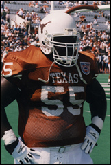 Born in Gladewater Texas in 1974, Stonie enjoyed a childhood filled with love, laughter, family and sports. His successes on the gridiron and in the classroom earned him a scholarship to attend the University of Texas at Austin. Stonie was a star defensive lineman for the Longhorns, lettering in 1992, 1993, 1994 and 1995. He was the defensive captain of the final Southwest Conference Championship team (1995) and the author of one of the most memorable plays in UT history. 'The Stop', Stonie's game winning tackle vs Oklahoma, was Sports Illustrated's Defensive Play of the Year (1994) and has garnered him recognition throughout the state and endeared him to Longhorn fans throughout the country.